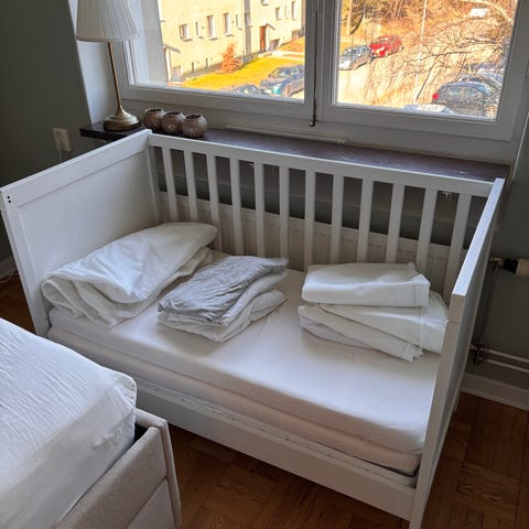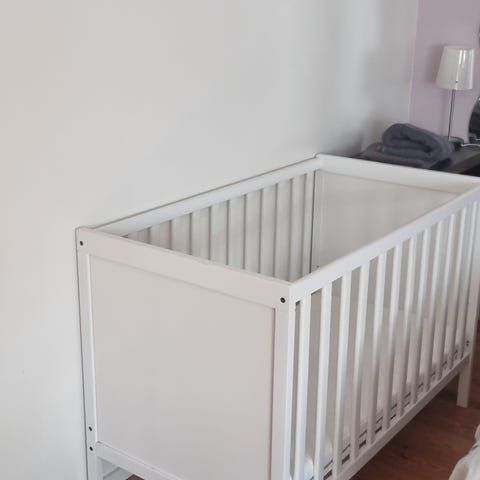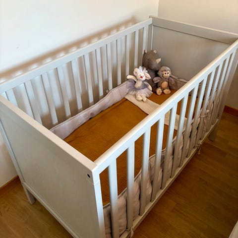 Till spjälsängen så finns det madrass, spjälsängsskydd och organizer från Zara home. Dessa är nytvättade och fräscha. Finns även en matchande sängmobil.
