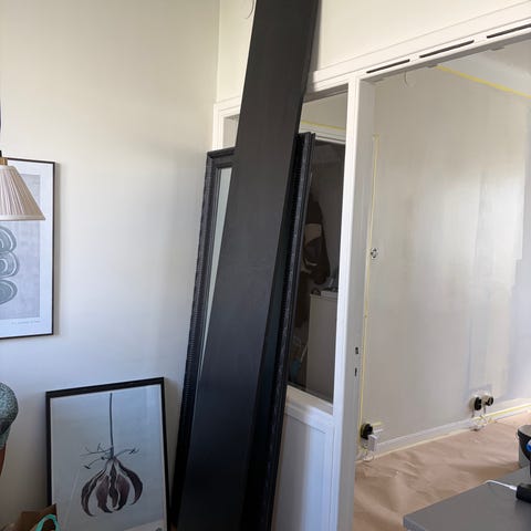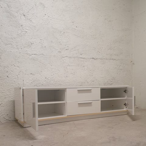 Fin förvaring, tre skjutdörrar /sektioner (två större fack, ett med ett hyllplan). Uttag för sladdar. Bortskänkes om snabb hämtning, pga flytt
