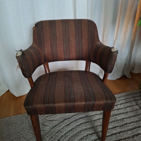 Designad av Carl Malmsten, 40-tal. Fint skick, helt tyg. Sköna att sitta i. Teak ben. Bruksslitage.