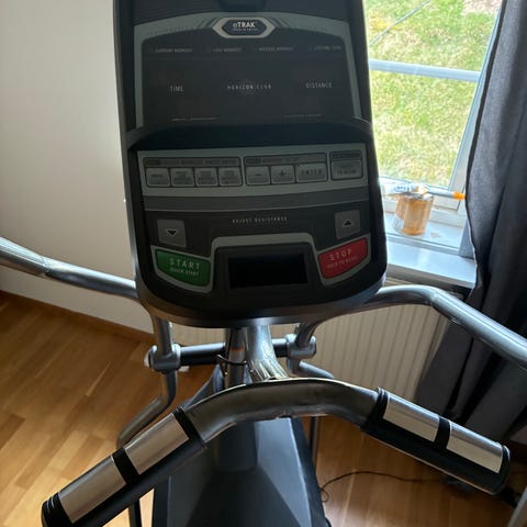 Crosstrainer i svart färg. Utrustad med display med knappar för inställningar och visning av träningsdata. Två fasta handtag med pulssensorer samt två rörliga handtag för helkroppsträning. Breda fotplattor för stabilitet under träning. Dock är en trasig går säkert byta ut. Passar för inomhusträning i hemmet.
