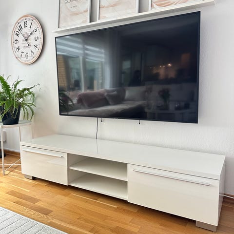Tv-bänk i ek. Liten fläck upptill. Höger glaslucka är svår att stänga.