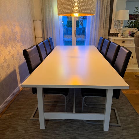 Säljer vårt massiva björkbord som är laserat med pärlgrå färg. Benen är vitmålade. 240 cm långt plus illägsskiva 62 cm. Stort bord där man kan sitta 12 personer med illägsskivan. Bordet laserar och lackar vi vid behov så blir det som "nytt". Kan såklart också slipas då det är massivt trä. Stolarna, 8st, är i vitt konstskinn och sköna att sitta i, dock har några av dem börjat spricka lite i "skinnet", dock endast på övre kanten. Se bild.