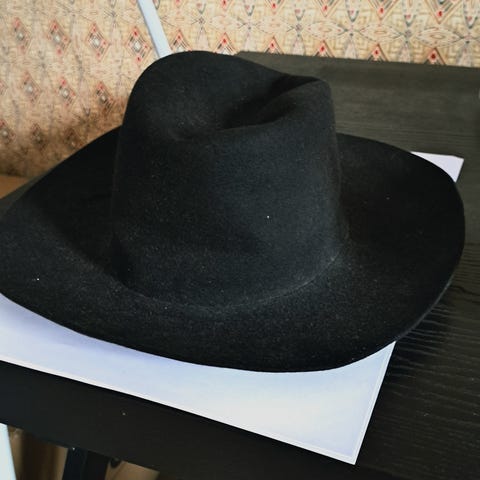 Kvalitetshatt från Tonak med dekorativt band runt kullen och fjäderdekoration på sidan. Innermått 56 cm, sparsamt använd och välskött. Matchande mönstrad scarf ca 85 x 85 cm och oanvända skinnhandskar storlek 6 3/4 - 7.