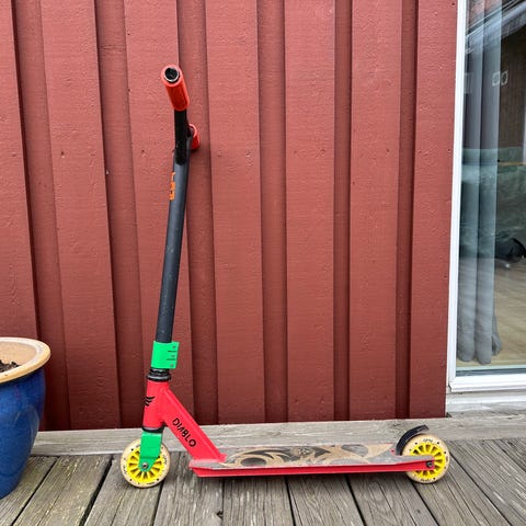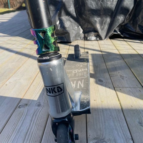 NKD sparkcykel i trickmodell. Styre i svart färg med T-form och greppvänliga handtag. Deck i flerfärgad metallicfinish med tryckt grafik. Utrustad med små hjul anpassade för trick- och parkåkning. Passar för barn och ungdomar som vill åka sparkcykel på ramper eller plana underlag.