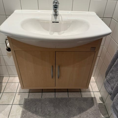Badrumsinredning bestående av kommod med tvättställ och två lådor, spegelskåp med belysning, duschvägg i glas med duschblandare, handdukstork och kromad väggkrok. Kommod och spegelskåp har träfärgad front och sidor. Handdukstorken är väggmonterad med flera ribbor för upphängning av handdukar. Duschväggen är svängbar med två glasdörrar och väggprofiler i metall. Inredningen är avsedd för montering i badrum och ger förvaring, spegelyta, duschplats samt möjlighet att torka handdukar.