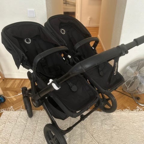 Bugaboo Donkey 5 syskonvagn. Vagnen har beige textil med svarta detaljer och svart chassi. Utrustad med individuella suffletter, fempunktsbälten och frontbygel.