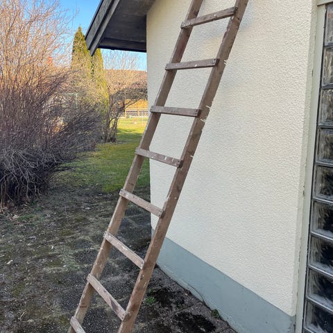 Väggstege i svart metall. Stegen har raka sidoprofiler och horisontella steg med jämna mellanrum. Övre delen är utformad för montering mot vägg eller fasad. Passar exempelvis som fasad- eller takstege där en fast steglösning behövs. Materialet är metall med lackerad yta i svart färg.