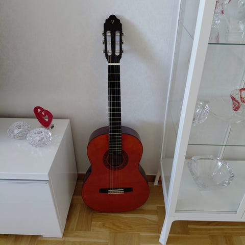 Gear4music klassisk akustisk gitarr i naturfärg. Gitarren har nylonsträngar, helkropp i trä med ljus topp och mörkare sidor och baksida. Hals och huvud är i mörk träfinish med öppna stämskruvar. . Lämplig för både nybörjare och mer erfarna gitarrister som vill ha en standardstorlek klassisk akustisk gitarr.