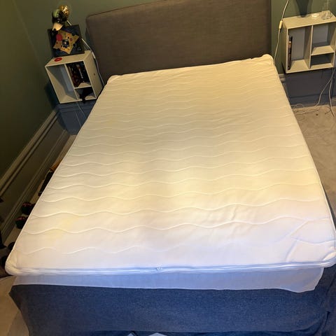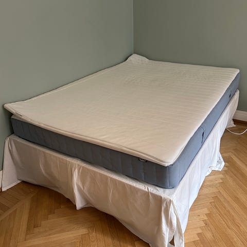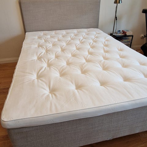 140 cm IKEA säng med resårmadrass i vit färg. Sängen består av en resårbotten med tillhörande madrass och sängkappa. Passar som dubbelsäng eller rymlig enkelsäng.