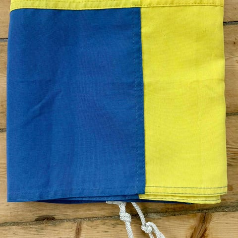 Svensk flagga i blått och gult tyg. Passar exempelvis för upphängning på vägg, flaggstång eller som dekoration vid högtider och evenemang. Materialet är textil/tyg med sydda kanter längs sidorna.