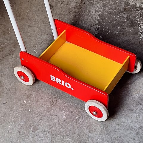 BRIO gåvagn i trä. Inget fel på funktionen, se bilder för exempel på märken samt brio trycket på ena sidan.