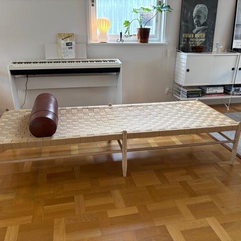 Vackert dansk design soffa/dagbädd. Mycket sparsamt använd, främst som inredningsdetalj i djurfritt hem. Längd 200 cm, bredd 80 cm, sittdjup 60 cm.