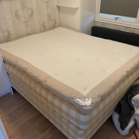 Hästens säng med klassiskt blåvitt rutigt tyg. Sängen består av en resårbotten med ben och en ovanpåliggande madrass i samma tyg. Passar som dubbelsäng i sovrum eller gästrum. Klädseln har rutmönster i blått och vitt, och benen är i trä. Mått 210X180.