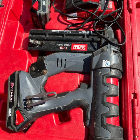 Milwaukee magnetborrmaskin med tillhörande batteri och laddare i förvaringsväska. Setet innehåller , batteri, laddare och handtagstillbehör.