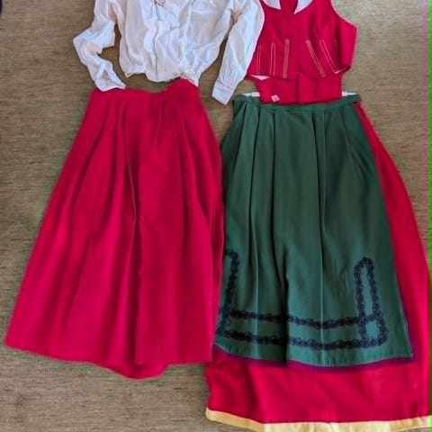 En handsydd skedevidräkt - blus, väst, kjol, förkläde, sjal, smycke i silver, väska och huvudduk i mycket gott skick, använd endast två gånger. Storlek 40/42.