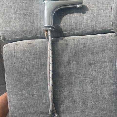 Badrumskran i krom med vattenfallsutlopp. Modern, rektangulär design med enkel spak för reglering av vattenflöde och temperatur. Avsedd för montering på tvättställ/handfat. Levereras med anslutningsslangar enligt bilder.