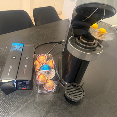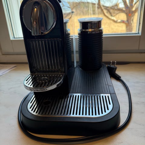 Nespresso kapselmaskin för espressokapslar. Maskinen har svart ovandel, blå sidopaneler och droppgaller i metall. Utrustad med avtagbar vattentank baktill och uppsamlingsbehållare för använda kapslar. Passar för bryggning av espresso och liknande kaffedrycker med Nespresso-kompatibla kapslar i hem- eller kontorsmiljö.