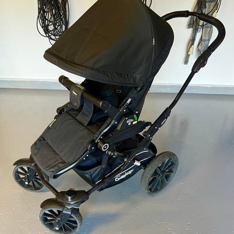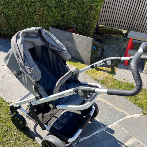 Bugaboo Donkey 5. I mycket fint skick. Något solblekt. Den kommer med 2 sittdelar, 1 liggdel, en sidväska, en ståbräda, 2 åkpåsar och 1 regnskydd. En plastdel är sprucken på sidan, men du kan enkelt köpa den delen på Bugaboos hemsida.