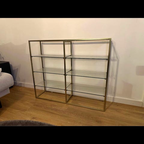 Vägghylla i mässing 45x75 i förpackning. Metall i mässing och hyllplanen i glas.