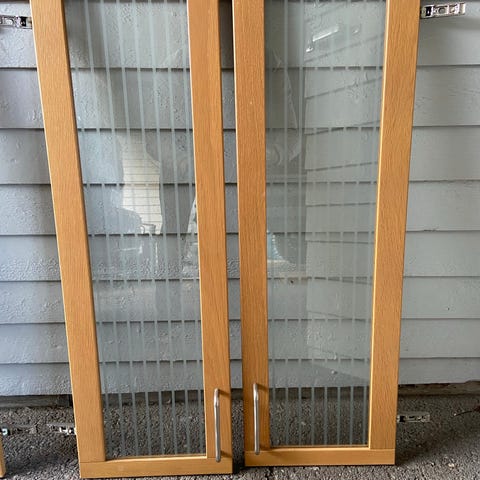 Badrumsskåp i klassisk furu med vikdörrar och handtag i metall. Magnetlås som håller dörrarna stängda. Tre hyllplan.