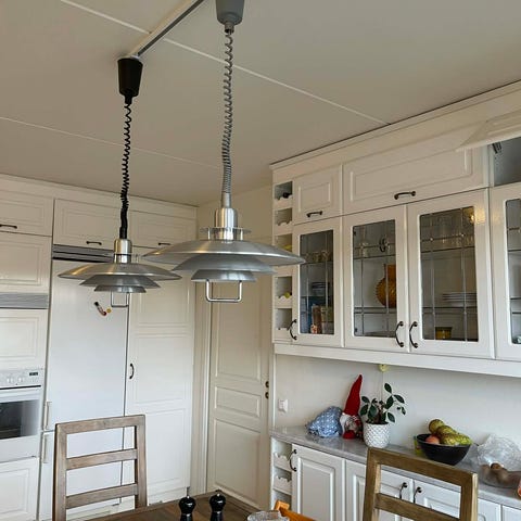 Svensktillverkad, vit, kökspendel helt utan märken repor eller fläckar. Nypris: ca 2 500 kr. Lampan är dimbar och går att höja och sänka efter behov, tack vare handtaget i kromad metall. 43 cm i diameter. Höjd: 20 centimeter. Hissupphäng 0,6-1,6 meter med inkluderad takkopp för krokupphängning.