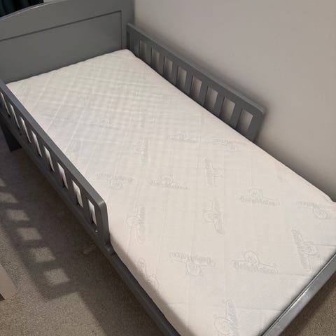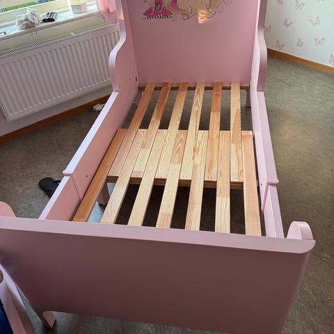 Jollyroom juniorsäng i rosa färg med Minnie Mouse-motiv på huvud- och fotgavel. Sängen är utformad för barn som har vuxit ur spjälsäng och passar standard junior-/barnmadrass (ca 70x140 cm enligt produktbildens text). Träribbotten ingår. Sängen har delvis höga sidor som kan ge viss avskärmning och minska risken att barnet rullar ur. Passar i barnrum med Disney- eller Minnie-tema.