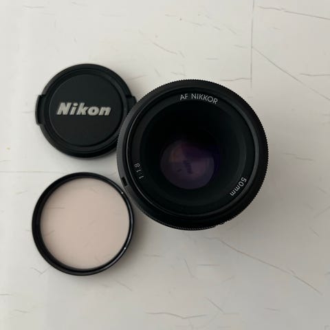 Nikon Nikkor 85mm 1:2 objektiv med motljusskydd och UV-filter. Objektivet har en brännvidd på 85mm och en maximal bländaröppning på 1:2. Serienummer 179815.