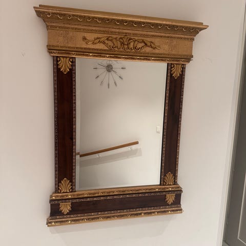 Spegel med dekorativ guldram. Spegeln har en kraftig, profilerad ram med klassiska ornament och reliefdetaljer upptill och nertill. Ramen är utformad med pelarliknande sidor och dekorativa mönster. Passar för placering mot vägg i hall, vardagsrum eller sovrum för helkroppsspegling och som inredningsdetalj. L 120 cm B 70 cm.