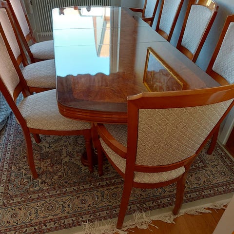 Mörkbrunt matbord i brunt trä och 6 stolar.