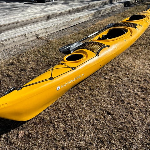 Väldigt lite använd havskajak paddel ,kapell och flytväst medföljer