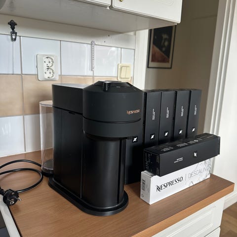 Vertuo Creatista har en vattentank med två liters kapacitet. Mjölkkannan rymmer 48 centiliter men bör inte fyllas över maxlinjen på 24 centiliter när du ska skumma mjölk. Maskinen stänger av sig automatiskt efter två minuter för att spara energi. Kapseltanken rymmer 10 små kapslar eller 6 stora kapslar åt gången.
