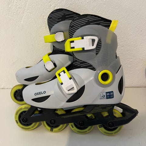 Marsblade inlines för barn i storlek 31. Svarta kängor med blå detaljer och blå hjul. Lämpliga för rullskridskoåkning och inlinesträning. Snörning framtill för justerbar passform och stöd runt fot och ankel.