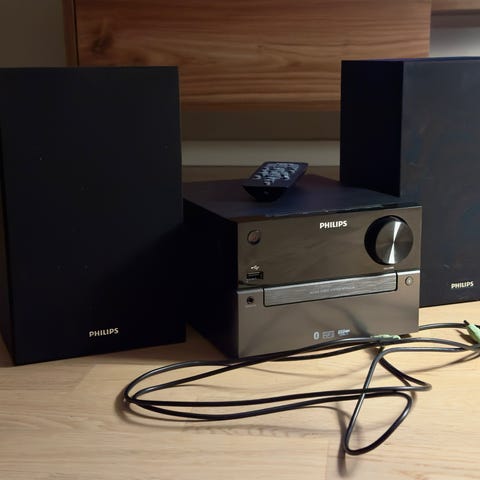 Philips stereopaket med centralenhet och två fristående högtalare i träfinish. Anläggningen har frontplacerade reglage och display samt volym- och funktionsvred på fronten. Högtalarna är tvåvägs med tygklädda frontrar. Systemet lämpar sig för användning i vardagsrum, sovrum eller mindre rum där man vill ha en kompakt stereo med separata högtalare.
