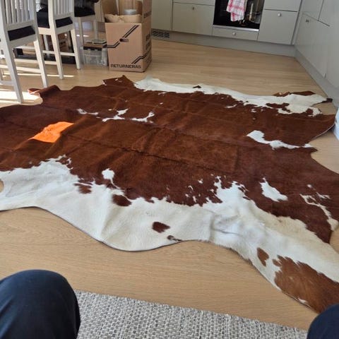 IKEA Ensta kohudsmatta i brun färg. Mattan är formad som en kohud och är avsedd för inomhusbruk. Passar som golvmatta i vardagsrum, matrum eller sovrum för att skapa en textil yta på trägolv eller andra hårda golv. Material och exakta mått framgår av etiketten på undersidan av mattan från IKEA-serien Ensta.