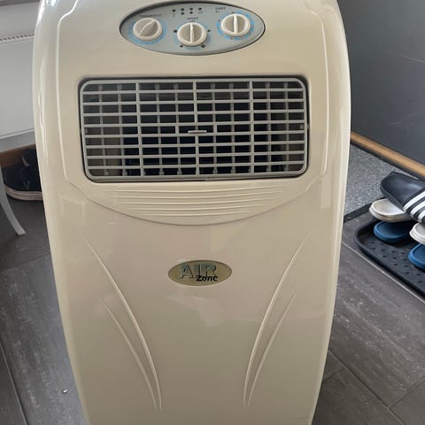 portabla luftkonditionering i vit färg. Enheten är fristående och är avsedd för inomhusbruk. Den har toppmonterat kontrollpanel med flera funktionsknappar och display, samt frontgaller för luftutblås. På ovansidan finns en separat fjärrkontroll. Baksidan är utrustad med anslutning för medföljande frånluftsslang och fönster- eller väggadapter för utblås. Produkten är lämplig för kylning av rum där fast installerad luftkonditionering saknas.