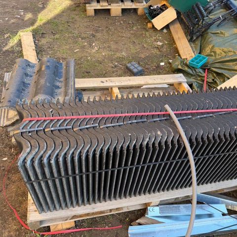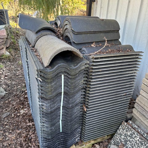 Takpannor i betong i grå nyans. Pannorna är staplade på pall utomhus och lämpar sig för takläggning, komplettering eller reparation av befintligt tak med liknande modell. Antal pannor vet jag inte exakt. Kanske 200st?