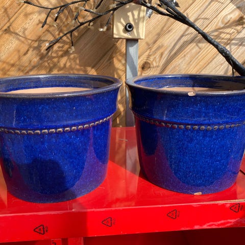 Krukor med väggfäste i terrakotta och metall. Setet består av flera runda terrakottakrukor monterade i en horisontell metallhållare med krokar för upphängning. Passar för plantering av mindre växter och örter på vägg, staket eller balkongräcke. Terrakottamaterialet är poröst och lämpar sig för utomhusbruk där överskottsvatten kan avdunsta genom god ventilation i krukans väggar.