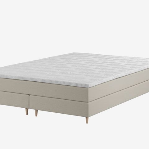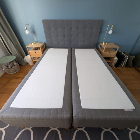IKEA säng med resårbotten i beige tygklädsel. Sängen står på mörka träben och har en plan liggyta med bäddmadrass ovanpå.