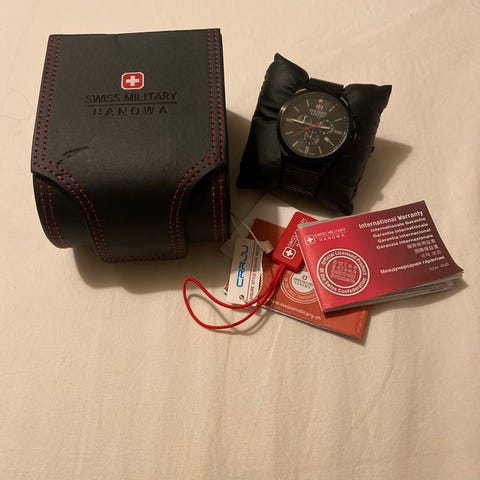 Swiss Military Hanowa herrklocka med svart urtavla och datumvisning. Klockan har ett armband i rostfritt stål med viklås och en rund boett i metall. Tydliga timmarkeringar och visare ger god läsbarhet. Levereras i originalask från Swiss Military Hanowa. Endast provad några dagar. Ligger i kartong. Säljes billigt och snabbt pga felköp. Ska ha automatverk istället. Kvitto garanti länkar finns.