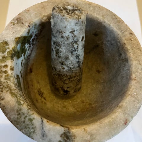 Åhléns Home marmeluskavel och mortel i vit marmor med grå ådring. Morteln levereras med tillhörande stöt. Marmeluskaveln har handtag i mörkt material. Passar för bakning samt för att mala och stöta kryddor eller örter i köket. Kaveln har ett ställ för förvaring.