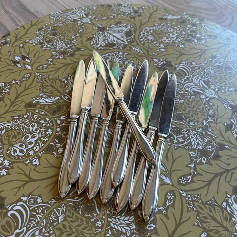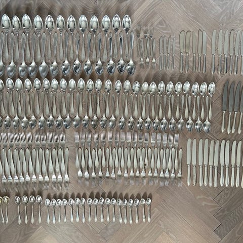 Matskedar, matknivar, matgafflar, förrättsgafflar, förrättsknivar och teskedar.