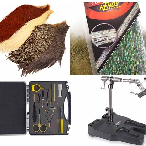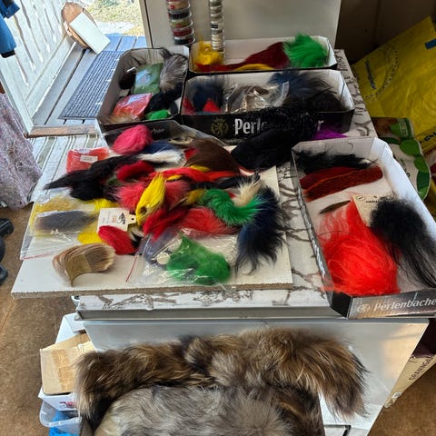 Flera askar med vintage flugor, många pimpelspön, två böcker, utrustning och material för flugbindning.
