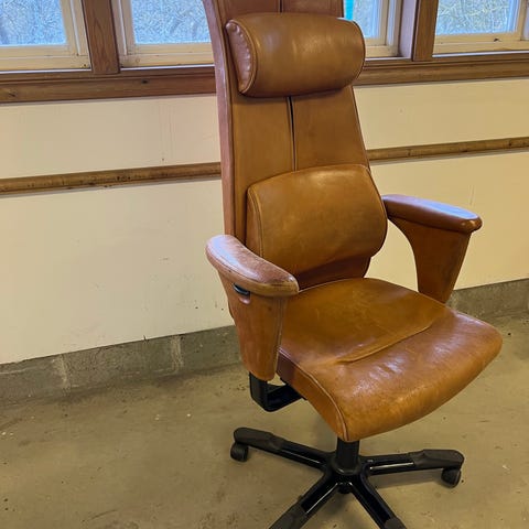 Rejäl stol bortskänkes. Märkt ”ortopeden”. Skysst läder, och höj & sänlhydraliken verkar funga super. Mycket ytrost.