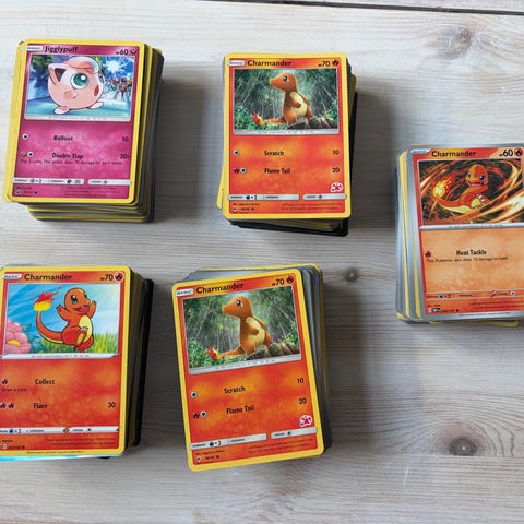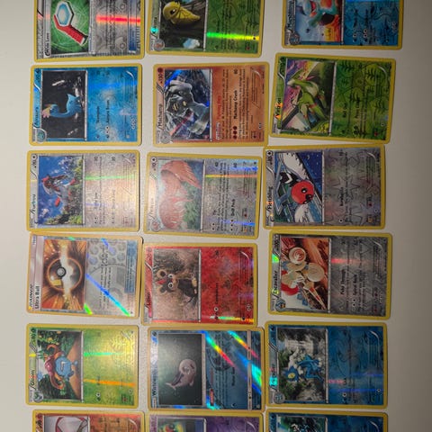 Pokémon samling spelkort med blandade motiv och typer. Kortens framsidor visar olika Pokémon-figurer och tränarkort i varierande färger. Baksidorna är de klassiska blå Pokémon-designade. Lämpliga för samling eller spel. Antalet kort och specifika serier framgår av bilderna.