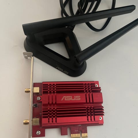Asus nätverkskort för stationär dator med PCI Express-anslutning. Kortet har röd kylfläns och två antennanslutningar på baksidan för trådlös uppkoppling. Passar i standard PCIe-plats i datorchassi. Lämpligt som trådlöst nätverkskort eller uppgradering av befintlig dator med stöd för WiFi via externa antenner.