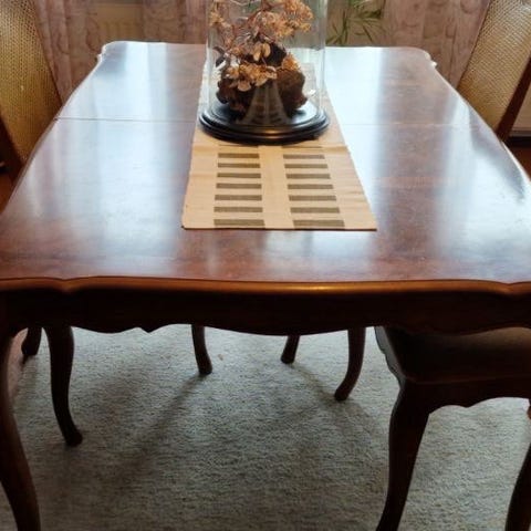 Matbord i lackat mörkbrunt trä. Finns två iläggsskivor a´38cm vardera.