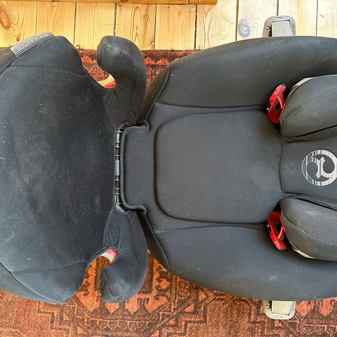Bälteskudde med ryggstöd upp till 36 kg. Stolsryggen kan höjas för rätt längd. Lutning på ryggstödet kan också justeras. Nytvättad, lite solblekt och lite nött på sittdynans sidor men inga övriga skador.