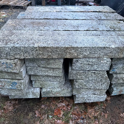 Granitplattor i grå nyans. Plattorna ligger staplade på pall och förekommer i olika storlekar och tjocklekar. Passar exempelvis för markläggning, trädgårdsgångar, uteplats eller andra utomhusmiljöer där natursten önskas. Viss variation i form och kanter förekommer.