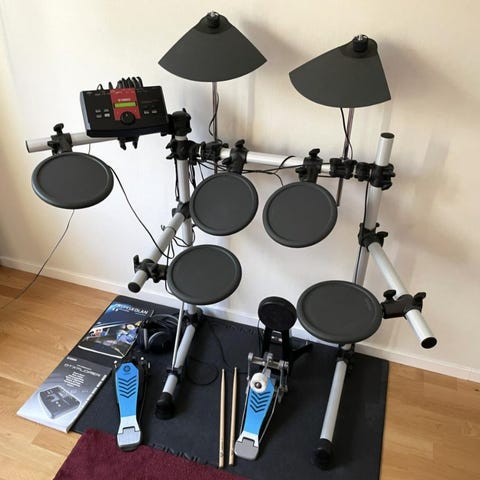 Hämtas i Dalby. En sladd fattas till pedalen för hihat. Pall ingår.