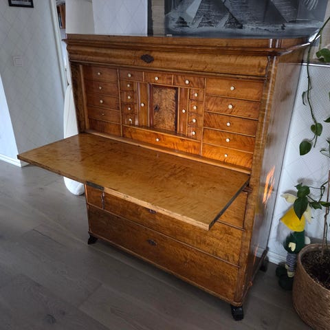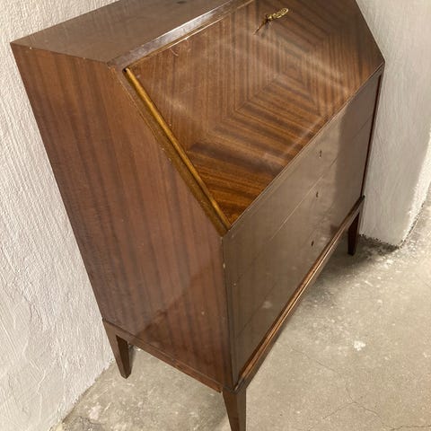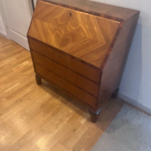Sekretär nymålad till vit med nya beslag. Fått sig lite stötar (se bild 3), men som löser sig lätt med lite ny färg. Nyckel saknas.